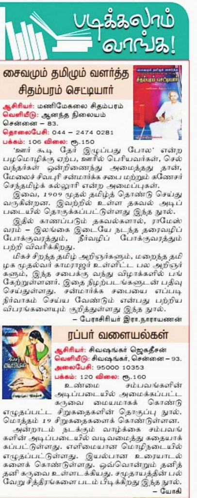 இன்றைய தினமலரில்(26-Aug-2021) படிக்கலாம் வாங்க பகுதியில் “ரப்பர் வளையல்கள்” சிறுகதைத் தொகுப்பு பற்றிய குறிப்பு இடம்பெற்றுள்ளது. ஆசிரியர்களுக்கு நன்றி.