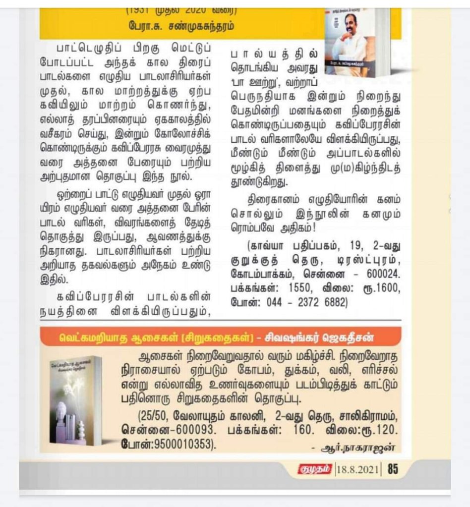 “குமுதம்” இந்த வார இதழில் (18-8-2021) “வெட்கமறியாத ஆசைகள்” சிறுகதைத் தொகுப்பு பற்றிய சிறு குறிப்பு வந்திருக்கிறது. ஆசிரியர்களுக்கு நன்றி.