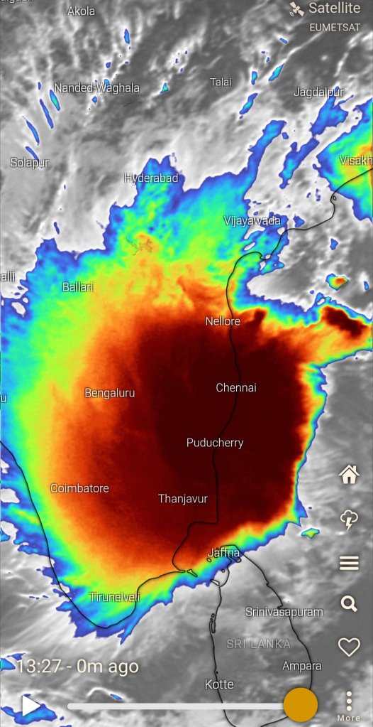 Install செய்து விட்டு Radar & Satellite — Satellite என்று Navigate செய்து வந்தால் இந்த Map நமக்கு காற்றழுத்த தாழ்வு நிலையின் தற்போதைய நிலை பற்றி படமாக காட்டி விடுகிறது.