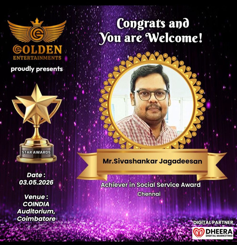 சிவஷங்கர் ஜெகதீசன் அறக்கட்டளையில் செய்து வரும் உதவிகளுக்காக சமூக சேவை பிரிவில் சாதனையாளர் விருது அறிவிக்கப்பட்டிருக்கிறது.